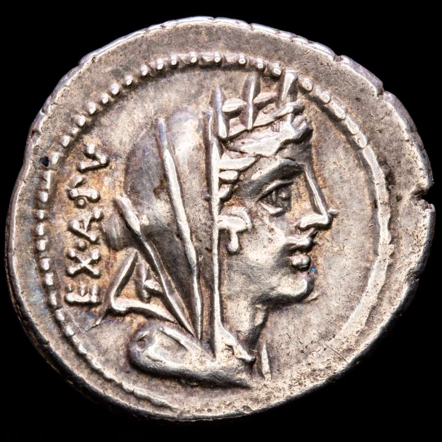 República Romana - L. Papius. Denario serrado de plata (3,87 g. 19 mm.) acuñado en Roma en 79 a.C. Cabeza de Juno Sospita a derecha, portando piel de cabra, detrás marca de control. / L•PAPI en exergo, Grifo a derecha, debajo símbolo. BMC-2977; Cal-1057; Craw-384/1; FFC-952; Se-1. Muy buena conservación.