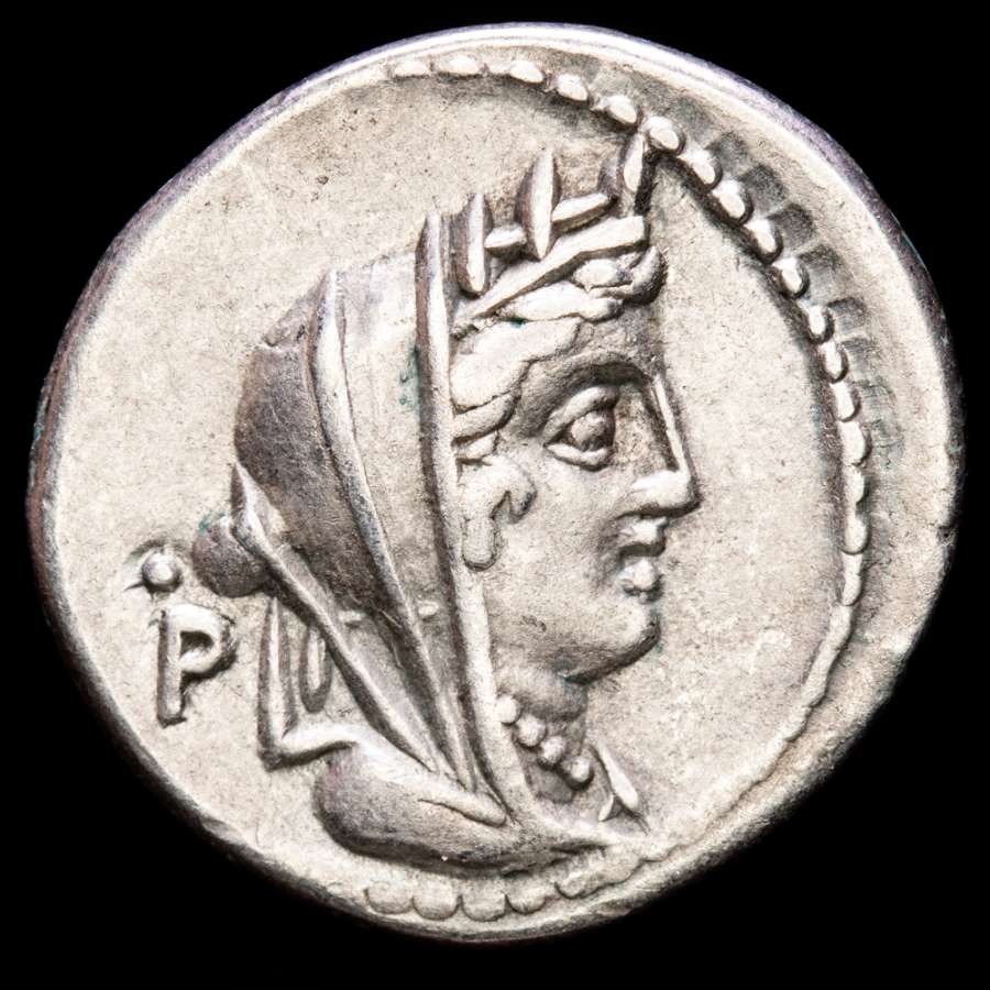 Republica Romana - Plaetoria. M. Plaetorius M.f. Cestianus. Denario de plata (3,77 g., 18 mm.). Roma, 67 a.C. Cabeza de Cibeles torreada a derecha, CESTIANVS. / Silla curul, simbolo a izquierda : M. PLAETORIVS. M.F. AED. CVR. Crawford 409/2; Sydenham 808. RBW 1484; RSC Plaetoria 3. EBC-